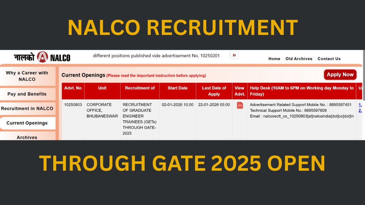 NALCO recruitment through GATE 2025 is now open for Graduate Engineer Trainee Posts. The official notification is now available at mudira.nalcoindia.co.in. Online applciation form started TODAY (January 2, 2026), and the last date to apply is January 22, 2026 (5:00 pm). Candidates of Mechanical, Electrical, and Chemical engineering discipline with valid GATE scores can apply.