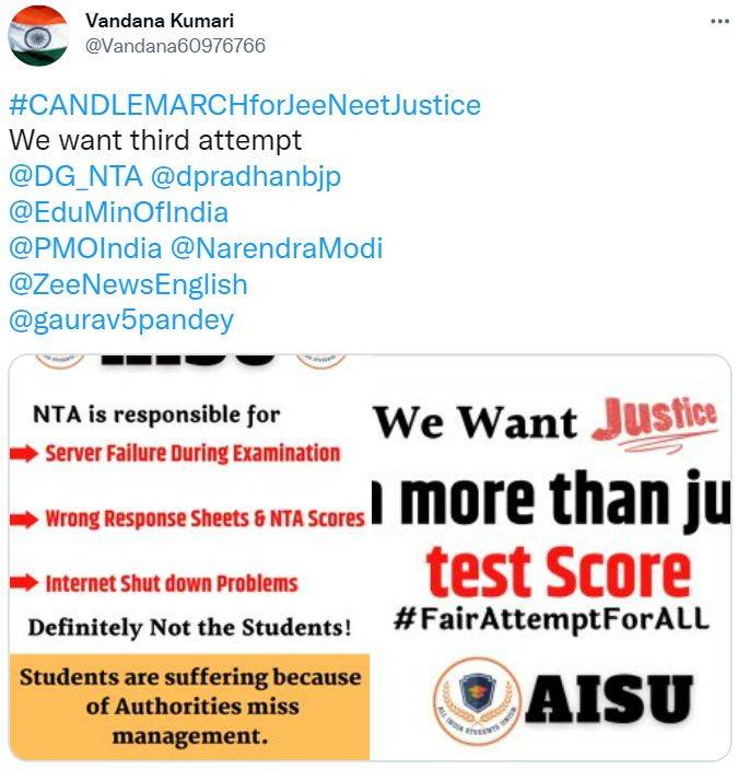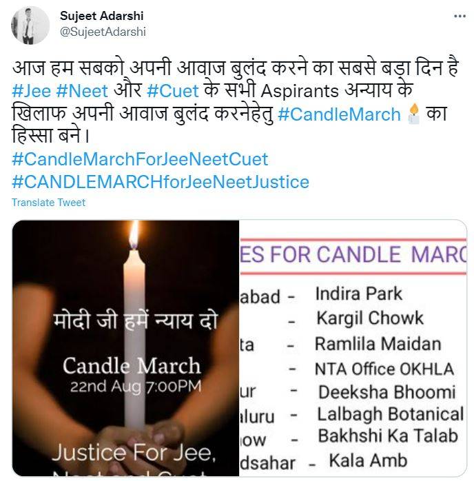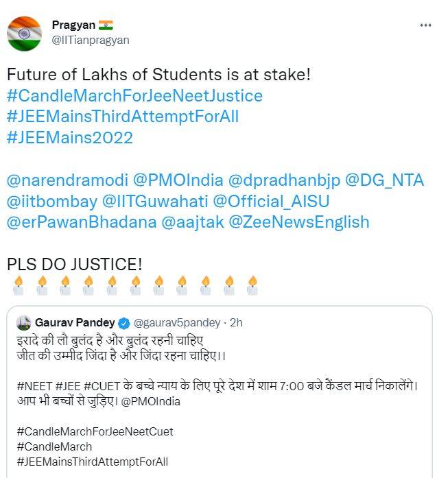 #CANDLEMARCHforJeeNeetJustice trends on Twitter
