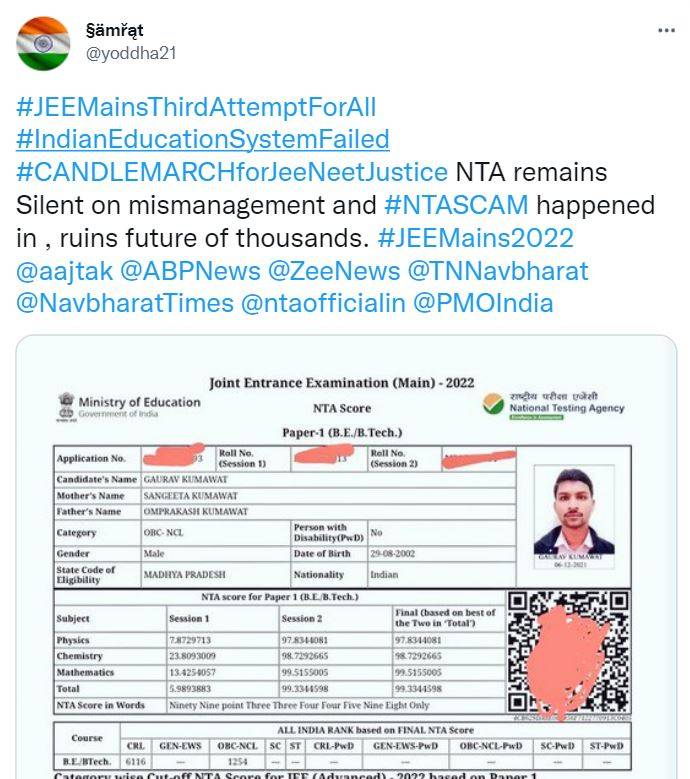 JEE Main, NEET and CUET aspirants are consistently stirring online campaigns with hashtags such as #CANDLEMARCHforJeeNeetJustice, #JEEMainsThirdAttemptForAll, #ChaloJantarMantar asking people to gather and voice their demands. The aspirants are urging the National Testing Agency (NTA) to organise one more session for both the entrance examination. JEE Main 3rd Attempt demand is on the rise.