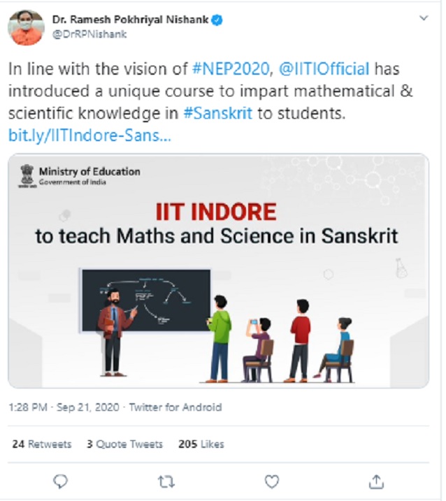 "In line with the vision of #NEP2020, @IITIOfficial has introduced a unique course to impart mathematical & scientific knowledge in #Sanskrit to students," the Education Minister tweeted.