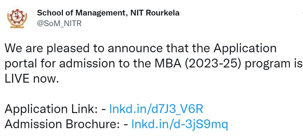 School of Management, National Institute of Technology (NIT) Rourkela has invited eligible candidates for admission to the Master of Business Administration (MBA) for the academic session 2023-25