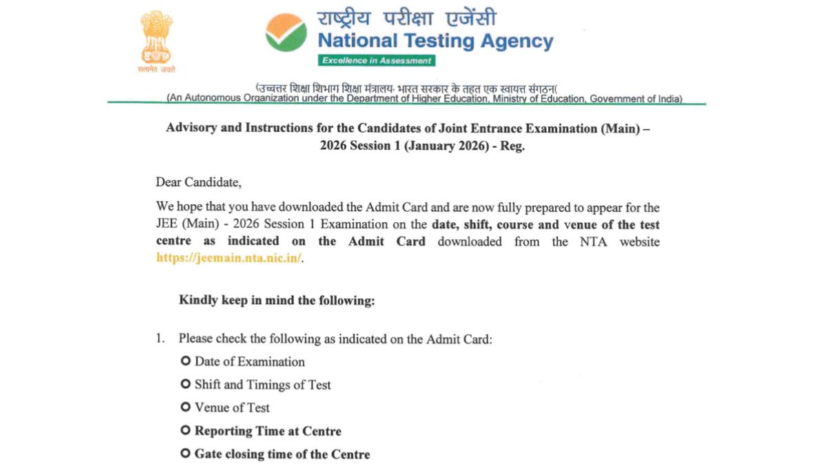The National Testing Agency has issued an important advisory for the JEE Main 2026 exam starting tomorrow. The advisory has some new important guidelines that candidates have to follow on the exam day. This includes UNLOCKED Aadhaar biometric authentication on exam day for a seamless biometric verification process. Read More details below.