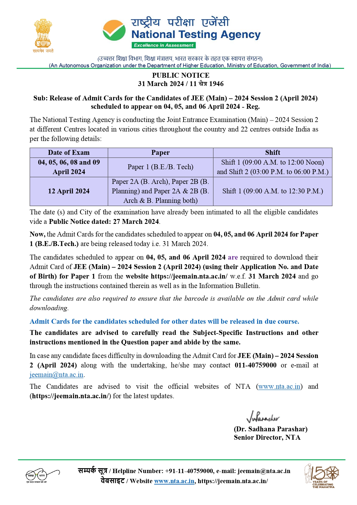 NTA has released JEE mains session 2 admit card for April 4, 5 and 6.