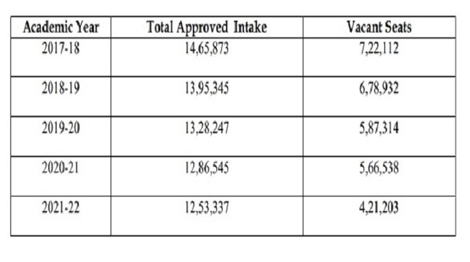 In the year 2018-19; around 6.79 lakh seats were vacant, in 2019-20 the number was over 5.87 lakhs, which further improved during the pandemic year 2020-21 to 5.66 lakh, the next year it saw a major improvement to 4.21 lakh.