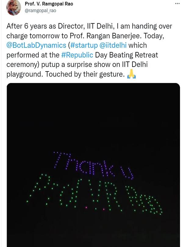 Botlab Dynamics, an IIT Delhi startup, had put up a surprise drone show to bid him farewell. Touched by the students' gesture, Rao wrote on Twitter, “After 6 years as Director, IIT Delhi, I am handing over charge tomorrow to Prof. Rangan Banerjee. Today, @BotLabDynamics (#startup @iitdelhi which performed at the #Republic Day Beating Retreat ceremony) put up a surprise show on IIT Delhi playground. Touched by their gesture.”
