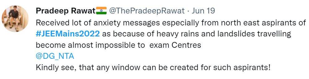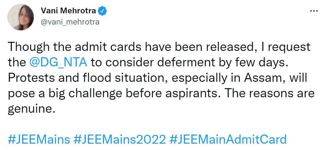 Though the admit cards have been released, I request the NTA to consider deferment by few days. Protests and flood situation, especially in Assam, will pose a big challenge before aspirants. The reasons are genuine.