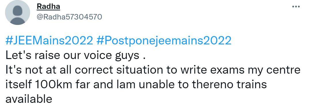 #JEEMains2022 #Postponejeemains2022 Let's raise our voice guys . It's not at all correct situation to write exams my centre itself 100km far and lam unable to thereno trains available