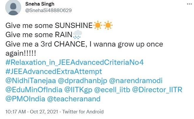 They added if providing third attempt is not an option, please let students appear at least twice in JEE Advanced with age limit criteria, by linking their attempts to Aadhaar card number. This way, a fair chance is give to each student. Scroll down to see students’ reactions.