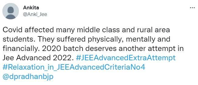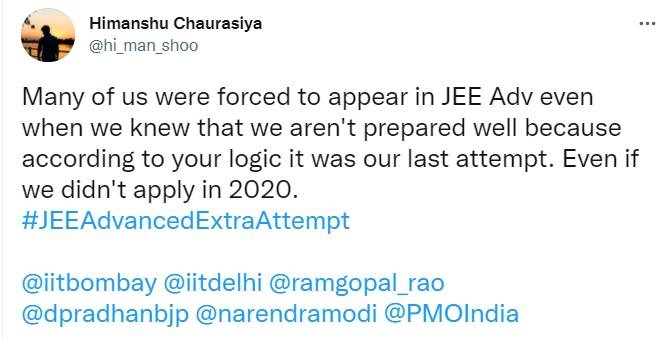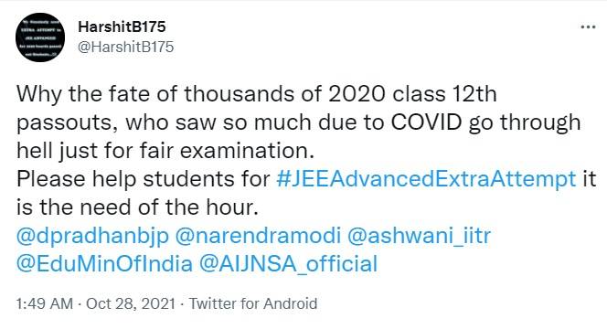 The students took to Twitter to express their concerns. One tweeted, “Pls support us regarding jee advanced 3rd attempt. And criteria number 4 This year has really been tough They cant expect us to prepare in such conditions that too for such a highly difficult exam #JEEAdvancedExtraAttempt,” while another tweeted, “We are the future of our Country!!!! Many B-town students had suffered a lot because of the pandemic. Please give 2020 batch JEE-Aspirants a 3rd JEE-Adv attempt.... #Relaxation_in_JEEAdvancedCriteriaNo4 JEEAdvancedExtraAttempt @iitbombay @ashwani_iitr @IITKgp @dpradhanbjp.”