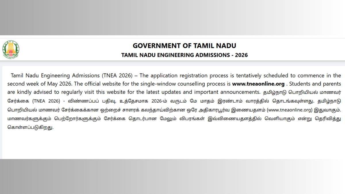 Engineering admissions in the state of Tamil Nadu will start from the second week of May 2026. The official website of the Tamil Nadu Engineering Admission (TNEA), tneaonline.org, has been updated for the 2026-27 counselling session. Check all details below.