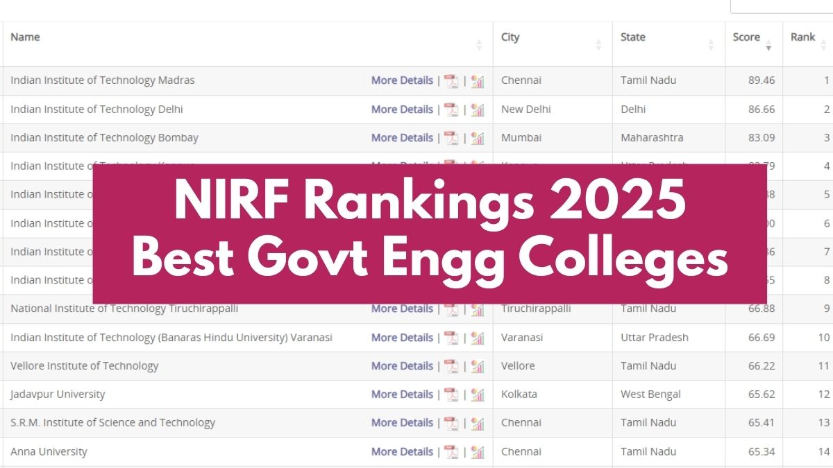 The much-awaited National Institutional Ranking Framework (NIRF) rankings for 2025 are out now. IIT Madras maintains #1 rank for the tenth consecutive year. The framework, approved by MOE, ranks institutes under various categories. While the top 10 government engineering colleges in India are dominated by IITs, check which non-IITs make it to the charts.