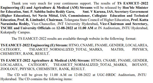 The CD of TS EAMCET 2022 result has been released at the press conference.