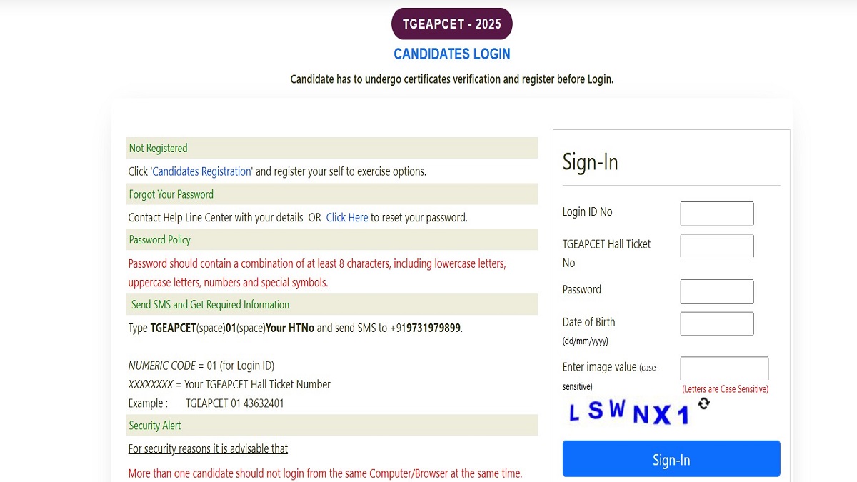 Step 3: Log in using Login ID No, TGEAPCET Hall Ticket No, Password & Date of Birth
