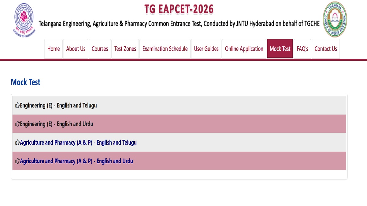 TS EAMCET Mock Test 2026: Jawaharlal Nehru Technological University, Hyderabad (JNTUH) has activated TS EAMCET mock test link for registered candidates. Those preparing for exam must take TS EAMCET 2026 mock test by visiting official website eapcet.tgche.ac.in. Official TS EAMCET mock test are of 4 types Engineering (E) - English and Telugu, Engineering (E) - English and Urdu, Agriculture and Pharmacy (A & P) - English and Telugu and Agriculture and Pharmacy (A & P) - English and Urdu.ย