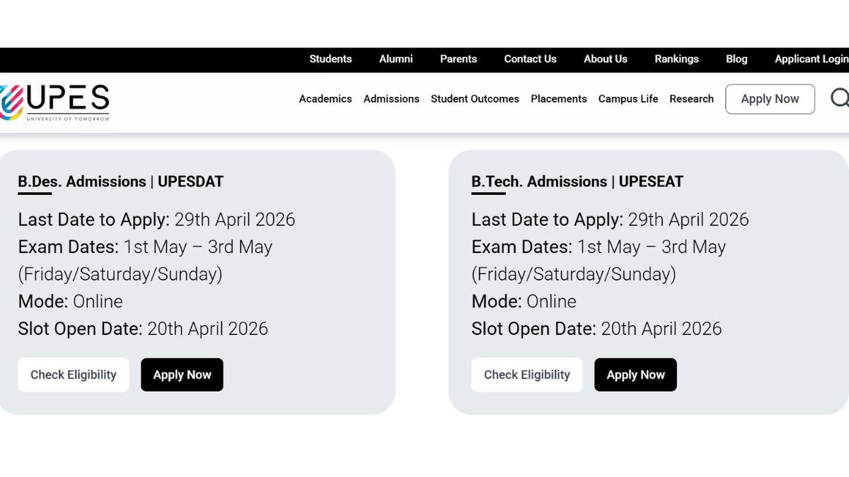University of Petroleum and Energy Studies (UPES) has extended the UPESEAT 2026 registration for phase 2. Those who score at least 50% in class 10th and 12th and also obtain 50% in class 12th PCM can apply for the exam. Candidates who seek B.Tech admission through UPESEAT must note that the last date to apply for UPESEAT 2026 is April 29, 2026. The UPESEAT application form is available in online mode on the website, upes.ac.in. The direct link to apply is given below.