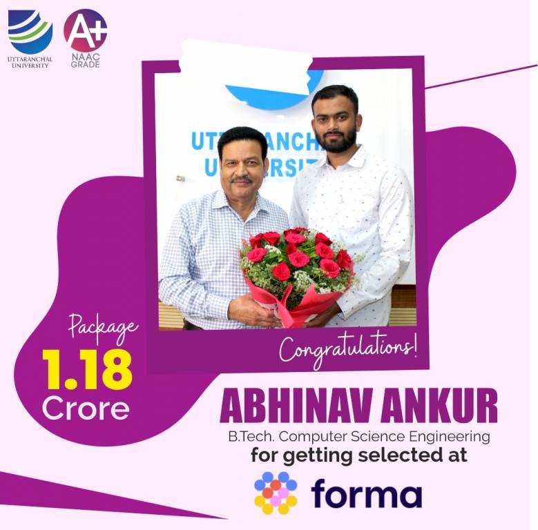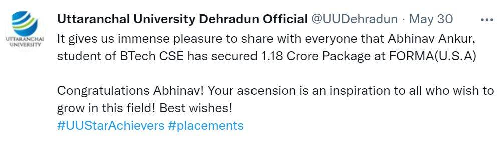 The varsity felicitated Abhinav Ankur for his achievement. The official tweet posted by Uttaranchal University reads, “It gives us immense pleasure to share with everyone that Abhinav Ankur, student of BTech CSE has secured 1.18 Crore Package at FORMA(U.S.A) Congratulations Abhinav! Your ascension is an inspiration to all who wish to grow in this field! Best wishes!”
