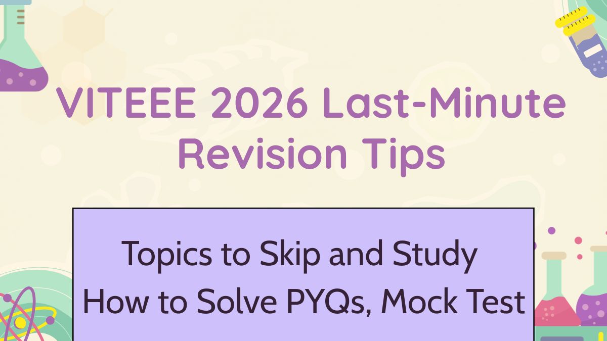 VITEEE 2026 Last-Minute Revision Tips: VIT Entrance Exam is set to take place from April 28. With few days remaining, it’s now time to utlise your study hours smartly and start revising chapters you’ve covered with daily PYQs and mock test solving. Here is a quick guide on VIT 2026 last-minute preparation tips to help you run through topics efficiently.