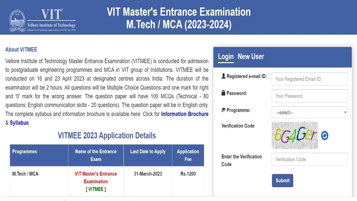 Vellore Institute of Technology Master's Entrance Examination (VITMEE) for admission to MTech and MCA courses will be held on April 16 and 23, 2023. The last date to apply is March 31, 2023. Candidates can register for VITMEE at admissions.vit.ac.in