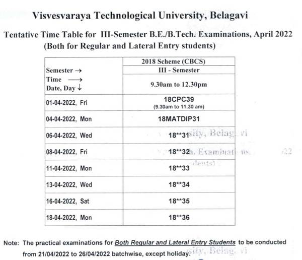 The third semester exams for undergraduate programmes at Visvesvaraya Technological University (VTU) will commence on April 1 and end on April 18. The exams will be held from 9.30 am to 12.30 pm.
