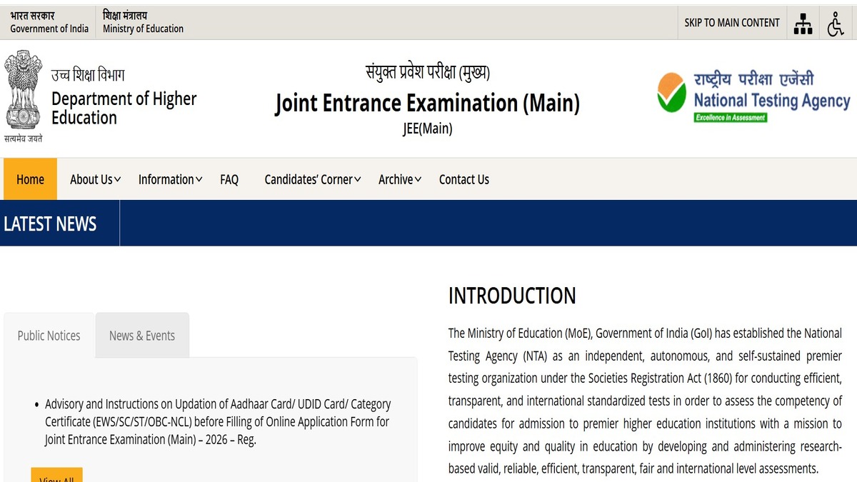 JEE Main 2026 Application form will be released online only. The link to apply will be available on the JEE Main website- jeemain.nta.nic.in. NTA has already activated the JEE Main 2026 registration demo link on the portal demo.nta.nic.in. Candidates can check details about JEE Main 2026 registration documents required, how to fill the form and application fee details from the demo link.