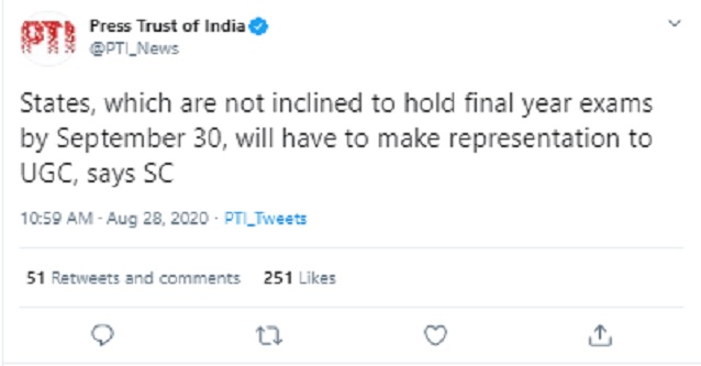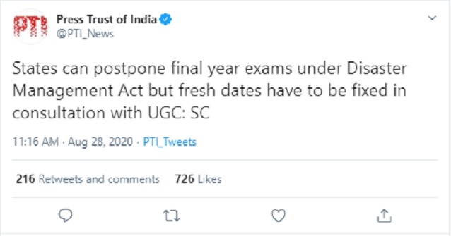 The apex court today said that the final year university exams are mandatory but it is not compulsory to be held before September 30. States can ask UGC for extension of the deadline. It also directed states and universities that they cannot promote students without holding final year exams.