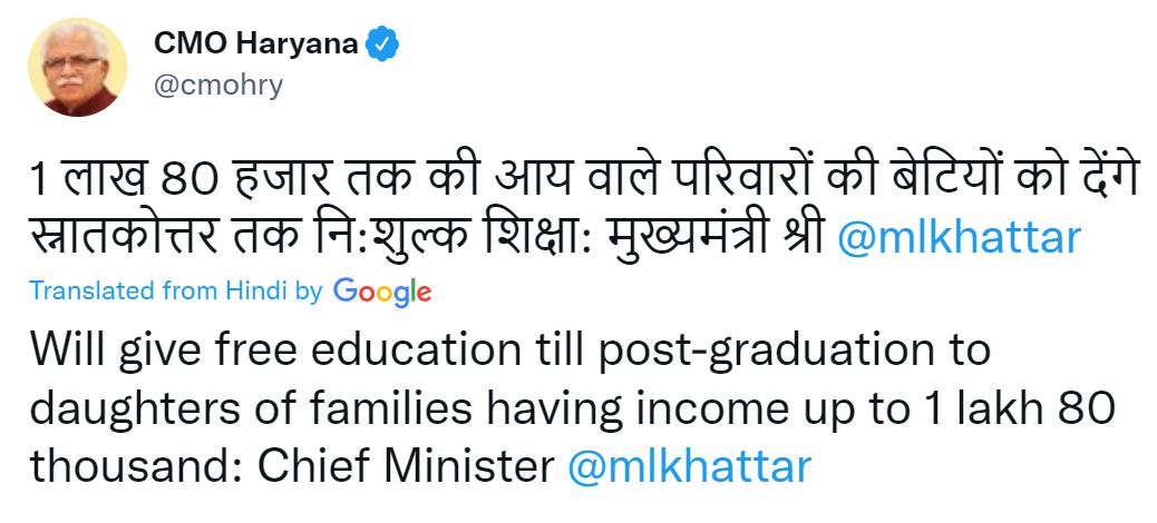 Free education for girl students: Female students pursuing post-graduation in government colleges and government-aided facilities of Haryana with an annual family income of less than INR1.80 lakh will not be charged tuition fees, according to an official statement tweeted by the official Twitter account of CMO Haryana.