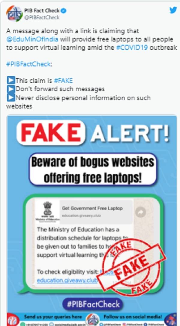 PIB Fact Check has asked people not to click on the link or share personal information. PIB took to Twitter and wrote: “A message along with a link is claiming that Education Ministry Of India will provide free laptops to all people to support virtual learning amid the COVID-19 outbreak.” “PIBFactCheck : This claim is Fake,” it added.