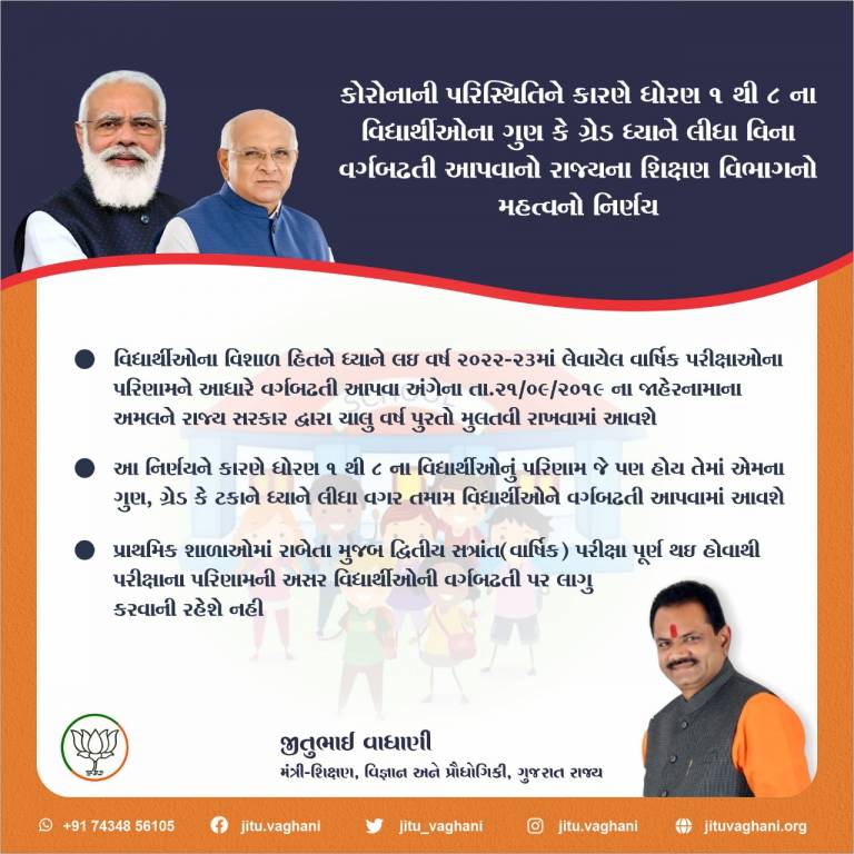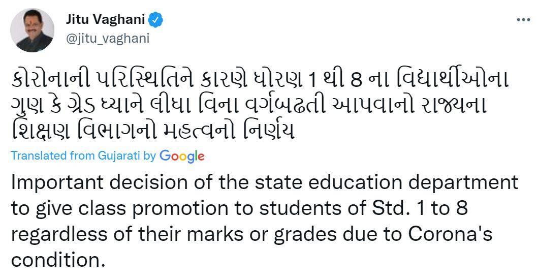 The government of Gujarat announced its decision to promote all students from Classes 1 to 8. The mass promotion will be done irrespective of the marks they have obtained due to the learning situation caused by the pandemic. The state education minister Jitu Vaghani announced the decision on Monday, May 3, 2022.