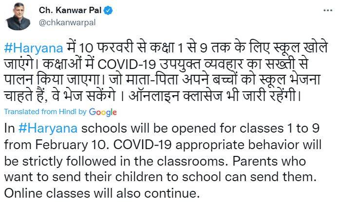 Pal through his official Twitter handle informed, "In Haryana, schools will be opened for Classes 1 to 9 from February 10. COVID-19 appropriate behavior will be strictly followed in the classrooms. Parents who want to send their children to school can send. Online classes will also continue."
