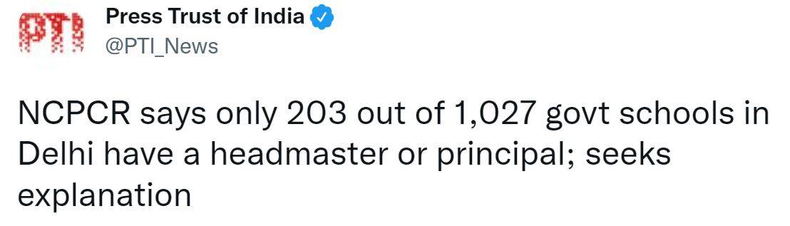 The NCPCR said there are 1,027 schools under the Department of Education, out of which only 203 schools have a headmaster/acting headmaster/ principal. According to PTI, NCPCR chairperson Priyank Kanoongo noted that the head of school has an important role to play in ensuring that schools have a positive learning environment and a caring and inclusive culture.