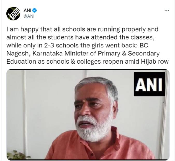 Karnataka Minister of Primary and Secondary Education BC Nagesh today told ANI that "I am happy that all schools are running properly and almost all the students have attended the classes, while only in 2-3 schools the girls went back. The government is waiting for the High Court judgment and once it is released, the SOPs in this regard will be issued."