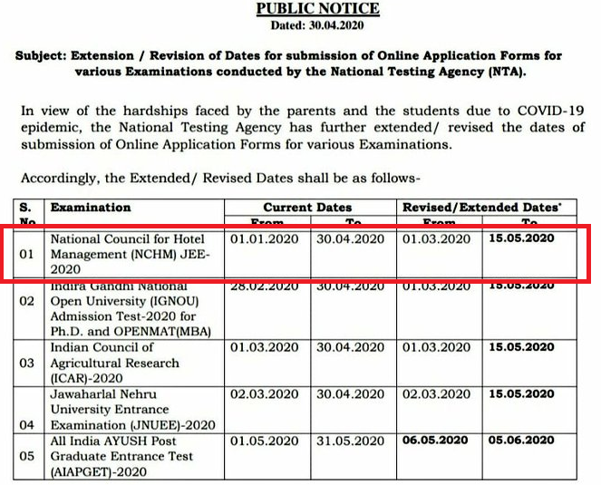 The National Testing Agency (NTA) has extended the last date of application for NCHMCT JEE 2020 until May 15. Earlier, the application window was scheduled to be closed on April 30 by 11:59 pm. Candidates can now fill the application form of NCHMCT JEE 2020 before 4 pm and, pay the application fee in online mode before 11:59 pm on May 15. Check the official notification released by NTA on Apri 30 around 2 pm:Β