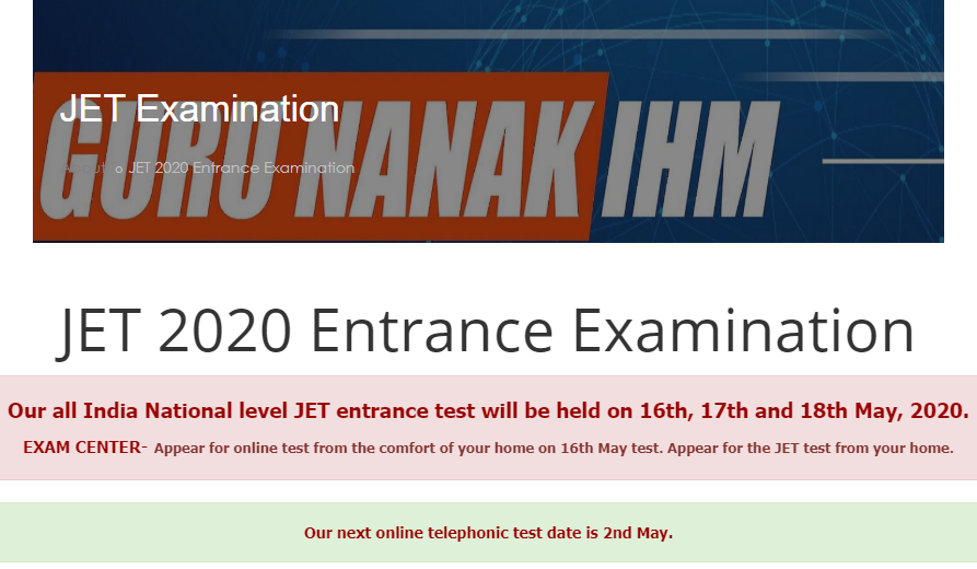 The Guru Nanak Institute of Hotel Management (GNIHM) has announced the exam dates for the upcoming Joint Entrance Test (JET) 2020. Now, GNIHM JET 2020 will be held on May 16 to 18 that candidates can take from their systems at home only. Earlier, GNIHM JET 2020 scheduled to be held on May 16 would have been conducted at various test centres in 12 locations. However, due to Coronavirus pandemic and lockdown, the university decided to conduct in such a mode that candidates can attempt the exam fro their home itself. Therefore, candidates can apply for GNIHM JET 2020 to take it from their home in an online mode.