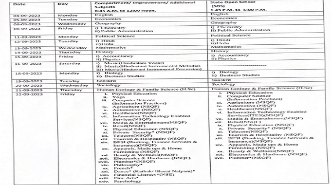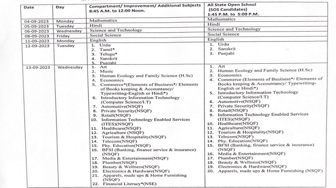 Following are the dates for other exams - September 13 - Maths, September 14 - History, September 15 - Accountancy and Physics, September 16 - Music, September 18 - Biology and Business Studies, September 19 - Sanskrit, September 20 - Sociology, September 21 - Human Ecology and Family Science and on September 22 - there will be Physical Education, Yoga, Computer Science, Agriculture, Automotive, Healthcare, Information Technology Enabled Services, Physical Education, Private Security, Telecom, Tourism and Hospitality, BFSI, Apparels, Made ups and Home Furnishing, Beauty and Wellness, Electronics and Harware, Plumber, Philosophy, French, Dance, Financial Literacy, Fine Arts, and Psychology.