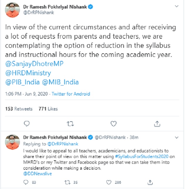 "I would like to appeal to all teachers, academicians, and educationists to share their point of view on this matter using #SyllabusForStudents2020 on MHRD's or my Twitter and Facebook page so that we can take them into consideration while making a decision," he tweeted.