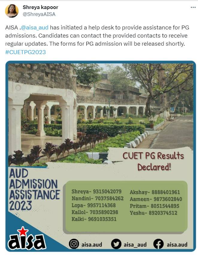 AUD PG Admission 2023: Candidates seeking admissions at Ambedkar University must note that the All India Students’ Association (AISA) at the Ambedkar University, Delhi, AUD has released helpline numbers for candidates seeking admission in postgraduate programmes offered by the university. The AUD is conducting the PG admission 2023 using the Common University Entrance Test for postgraduate, CUET PG 2023, held by the National Test Agency, NTA.