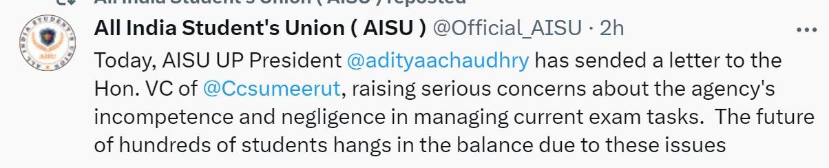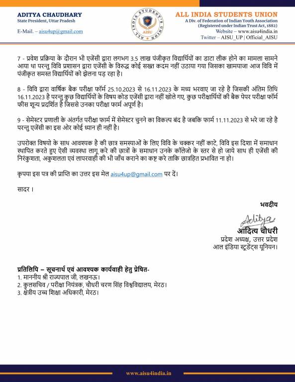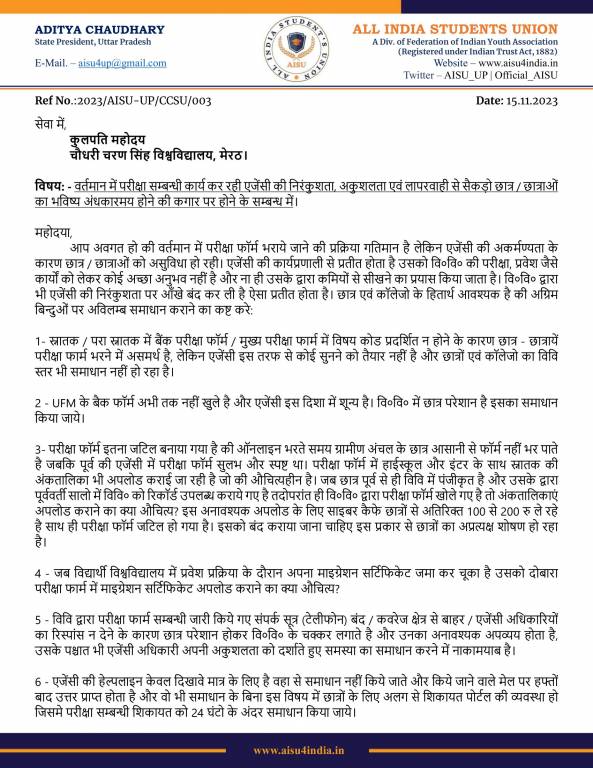 All India Students’ Union (AISU) UP President Adityaa Chaudhry addressed urgent concerns in a letter to the Vice Chancellor of Chaudhary Charan Singh University Meerut. In the official letter, the President has highlighted issues of incompetence and negligence in current exam management. “Hundreds of students' futures are at risk,” Chaudhry said in his statement to the varsity’s VC.