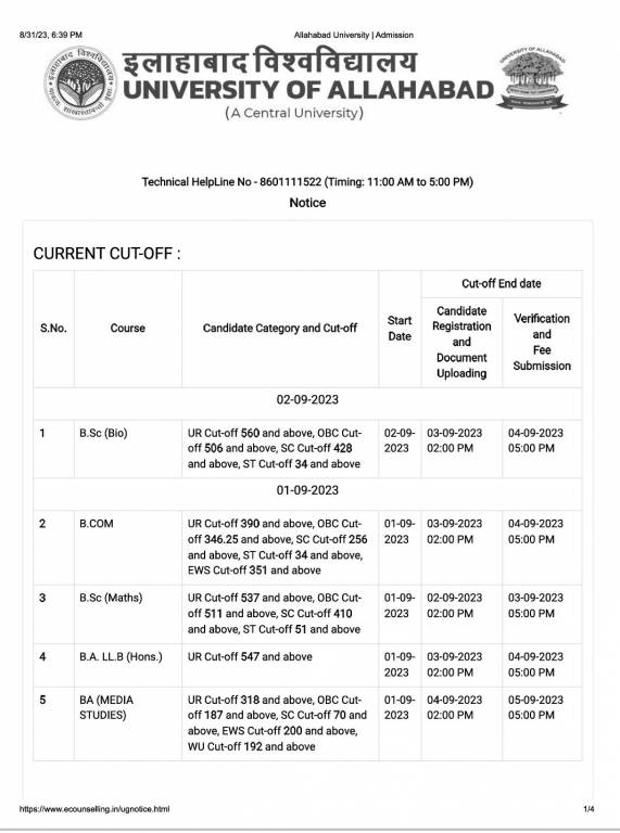 Allahabad University Cut Off 2023: The University of Allahabad has published the cut-off marks for various undergraduate programmes such as BCom, BSc, BCA and other subjects. Along with this, the varsity has also announced the dates for counselling.