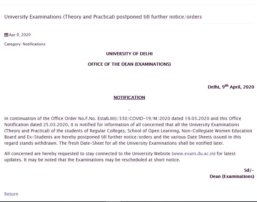 Earlier, DU released two notices, one to inform students that its registration process for admissions is on hold and another one informing the further extension of its closure. In order to practice social distancing as advised by the Prime Minister, the University decided to put its admission process on hold. National Testing Agency (NTA), the authority responsible for organizing and conductingΒ DU Entrance Test (DUET), for entrance-based UG courses and PG courses offered by the University, also postponed the application process for the Entrance exam.