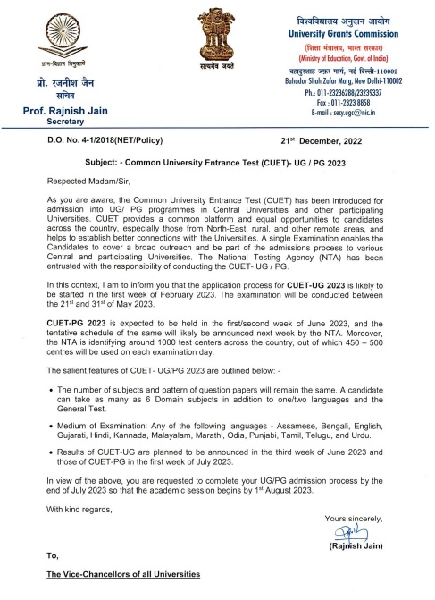 Results of CUET-UG are planned to be announced in the third week of June 2023 and those of CUET-PG in the first week of July 2023. In view of the above, you are requested to complete your UG/PG admission process by the end of July 2023 so that the academic session begins by 15t August 2023.