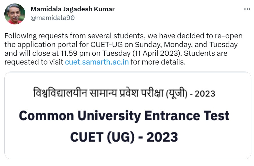 UGC Commission Chairman Mamidala Jagadesh Kumar tweeted, "Following requests from several students, we have decided to re-open the application portal for CUET-UG on Sunday, Monday, and Tuesday and will close at 11.59 pm on Tuesday (11 April 2023). Students are requested to visit cuet.samarth.ac.in for more details."