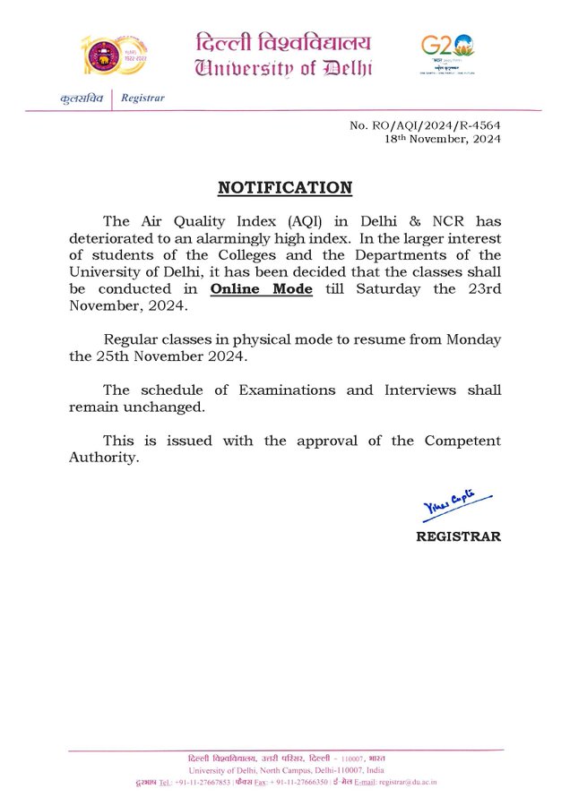With air quality in Delhi-NCR deteriorating to hazardous levels, Delhi University (DU) has announced that all its classes will be held online until Saturday, November 23, 2024. This decision comes as Delhi authorities implement stringent Stage 4 measures under the Graded Response Action Plan (GRAP) to deal with severe air pollution crisis affecting the Delhi NCR region.
