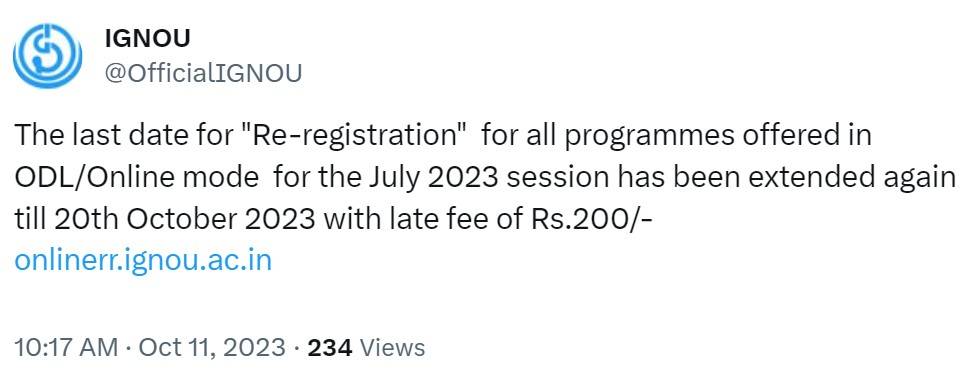 IGNOU extends deadline for July session fresh admission, re-registration 2023 until Oct 20