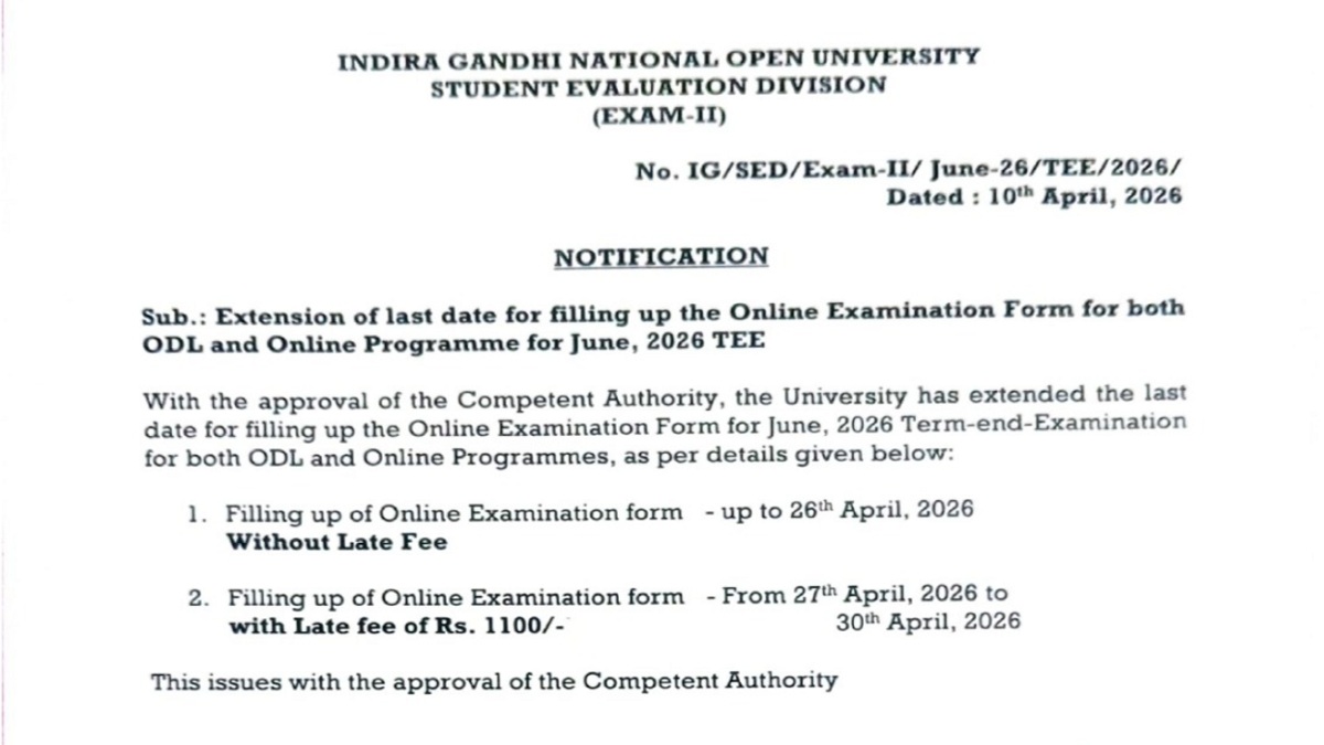 IGNOU has extended last date for submission of June 2026 TEE exam form to April 26 without late fee. Candidates can complete IGNOU TEE June exam registration by visiting official website ignou.samarth.edu.in.