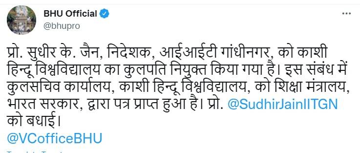 Jain who is a recipient of Padma Shri will hold the office of BHU VC for a period of three years from the day he assumes charge.