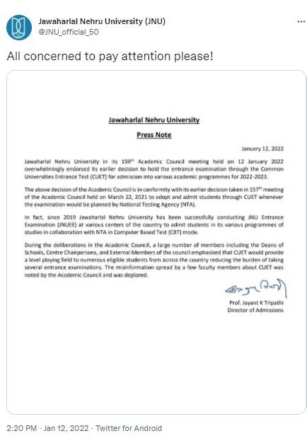 Jawaharlal Nehru University in its 159th Academic Council meeting held today; i.e. January 12, 2022, overwhelmingly endorsed its earlier decision to hold the entrance examination through the Common Universities Entrance Test (CUET) for admission into various academic programmes for 2022-23. The decision of the Academic Council is in conformity with its earlier decision taken in 157th meeting of the Academic Council held on March 22, 2021 to adopt and admit students through CUET whenever the examination would be planned by National Testing Agency (NTA).