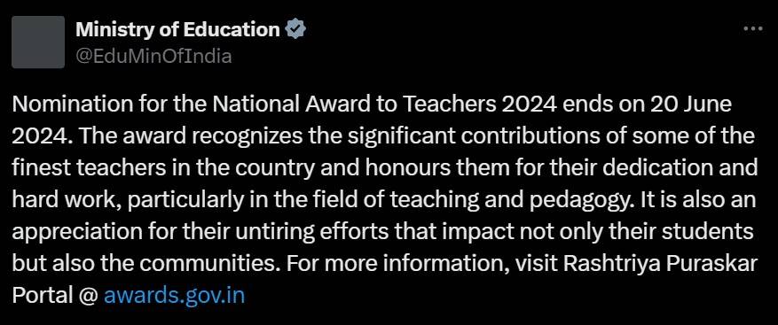 In a tweet on the social media platform X, the MoE informed, “Nomination for the National Award to Teachers 2024 ends on 20 June 2024. The award recognizes the significant contributions of some of the finest teachers in the country and honours them for their dedication and hard work, particularly in the field of teaching and pedagogy. It is also an appreciation for their untiring efforts that impact not only their students but also the communities. For more information, visit Rashtriya Puraskar Portal @ http://awards.gov.in.”