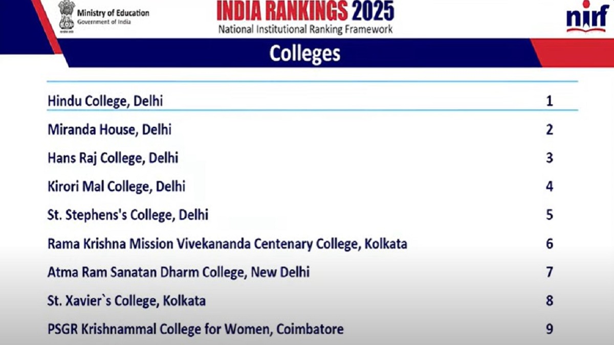 NIRF Ranking 2025 College List: The Ministry of Education has announced the National Institutional Ranking Framework (NIRF) 2025 today. In its 10th edition, Hindu College retained the top position in the College category, with Miranda House ranking second.