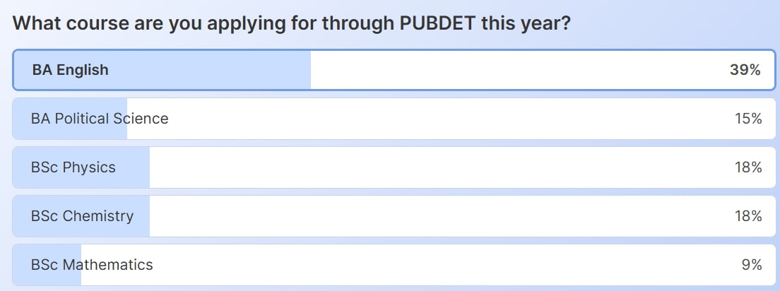 PUBDET 2025: In a recent poll survey conducted on students’ choice of UG programmes at Presidency University, it has been observed that the majority of aspirants wish to enrol on the BA English course. A total of 39% of all survey participants chose this programme. BSc Physics and BSc Chemistry were chosen by 18% of students, standing as the second most popular UG programmes at the university. 15% of students chose BA Political Science while only 9% chose BSc Mathematics.