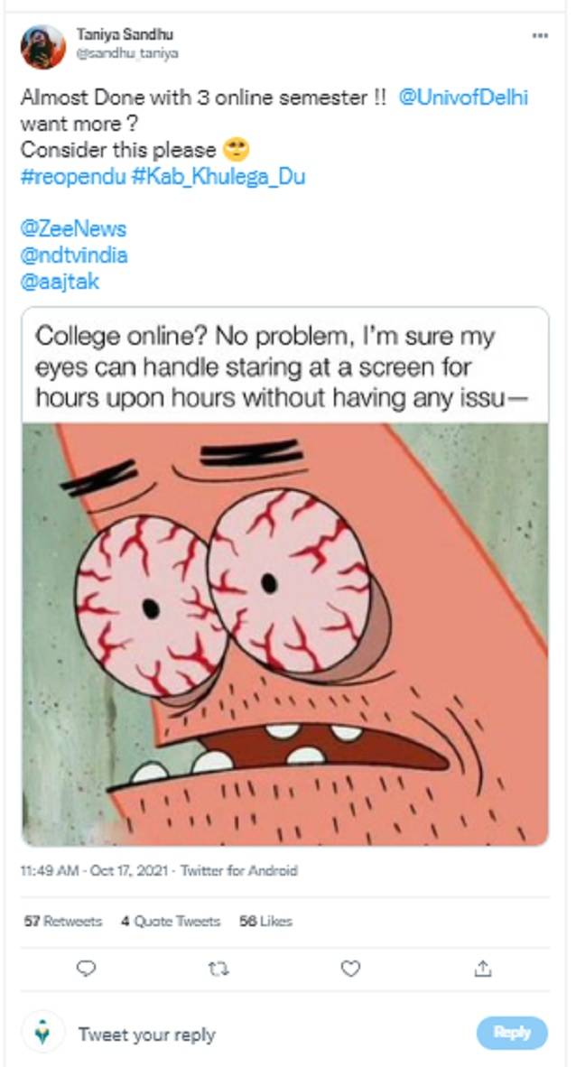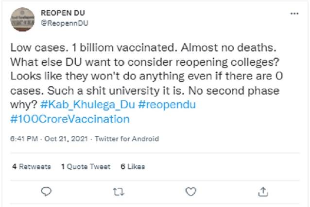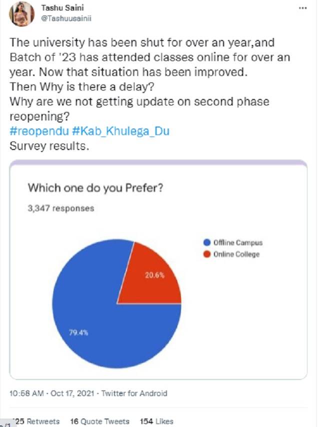 Taking to Twitter, one of the students tweeted," The university has been shut for over a year,and Batch of '23 has attended classes online for over a year. Now that situation has been improved. Then Why is there a delay? Why are we not getting updates on the second phase reopening? #reopendu #Kab_Khulega_Du Survey results."